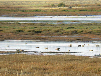Crockett Lake is a major stopover for an extraordinary number of shorebirds during northbound (April/May), and southbound (early July/October) migrations, the best times to visit. At least 17 species of shorebirds have been recorded here, including Western, Least, Baird's, Pectoral, and Semi-palmated Sandpipers, Black-bellied and Semi-palmated Plovers, and both Greater and Lesser Yellowlegs. This cornucopia acts as an attractor for Peregrine Falcons and Merlins, and Bald Eagles and Northern Harriers are also usually added to the mix. The surrounding grasslands and marshes have Savannah, Song and White-crowned Sparrows, Red-winged Blackbirds, Marsh Wrens, and American Goldfinches. Great Blue Herons use the lake as a foraging site during the breeding season. Ducks and gulls round out the mix.