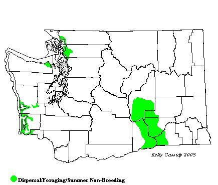 There have been only a few records of Cattle Egret's occurance in Washington during the breeding season, with records from Skagit and Pacific Counties in 1995 and Clark County in 1997. In 2002, two birds were seen at Burbank in Walla Walla County from mid-May to mid-June. There are no records of actual breeding. In the fall in most years, a few Cattle Egrets can be found on the coast of Washington, in Puget Sound, and in eastern Washington.